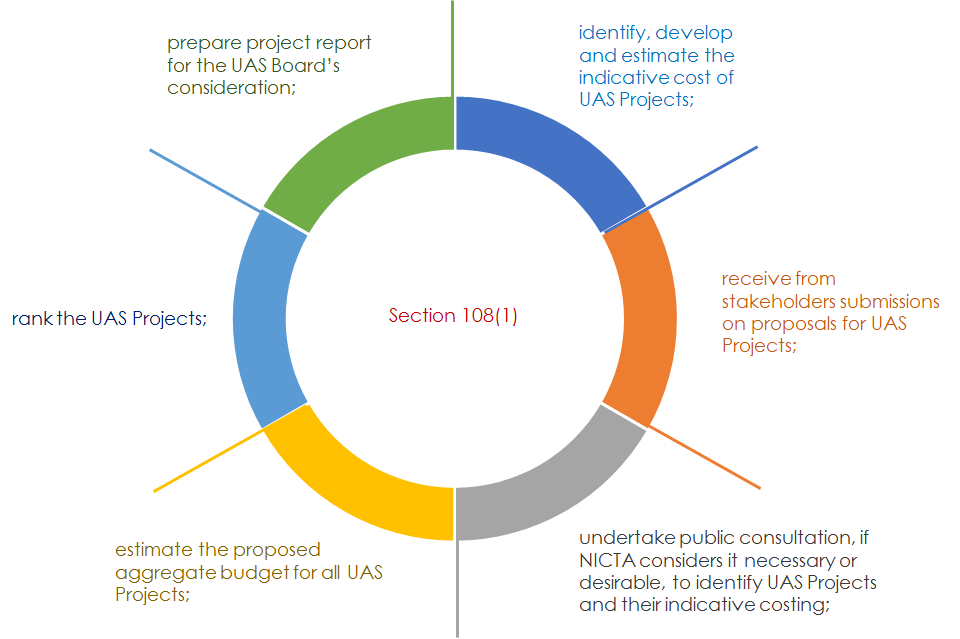 According to the National ICT Act, the UAS Board annually directs NICTA (via the UAS Secretariat) to create a report outlining proposed UAS projects for the year, including costs, prioritization, and budget. This report is submitted to the Minister of ICT for approval, after which NICTA implements the approved projects.